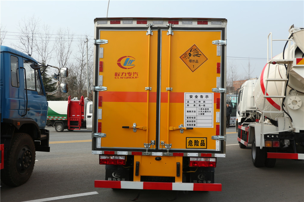 | 其他 | 隨底盤選裝駕駛室。危險貨物運輸車的車輛類型為:EX/Ⅲ,運送爆炸品的品名:黑火藥,壓縮黑火藥,電(非電)引爆雷管,爆破炸藥,導爆索,點燃導火索.煙花爆竹。 運送爆炸品的項號:1.1D,1.1D,1.1B,1.1D,1.4G.1.4G。車廂頂部封閉,不可開啟,選裝右側廂體前部開門,側防護為螺栓連接,后防護為焊接連接,后部防護裝置斷面尺寸(寬×高):50mm×100mm,離地高度為410mm.該車裝配具有衛星定位功能的汽車行駛記錄儀,該車裝配有限速裝置,ABS控制器型號及生產企業:CM4XL-4S/4M,廣州科密汽車電子控制技術股份有限公司,安裝前盤式制動器。 | ||