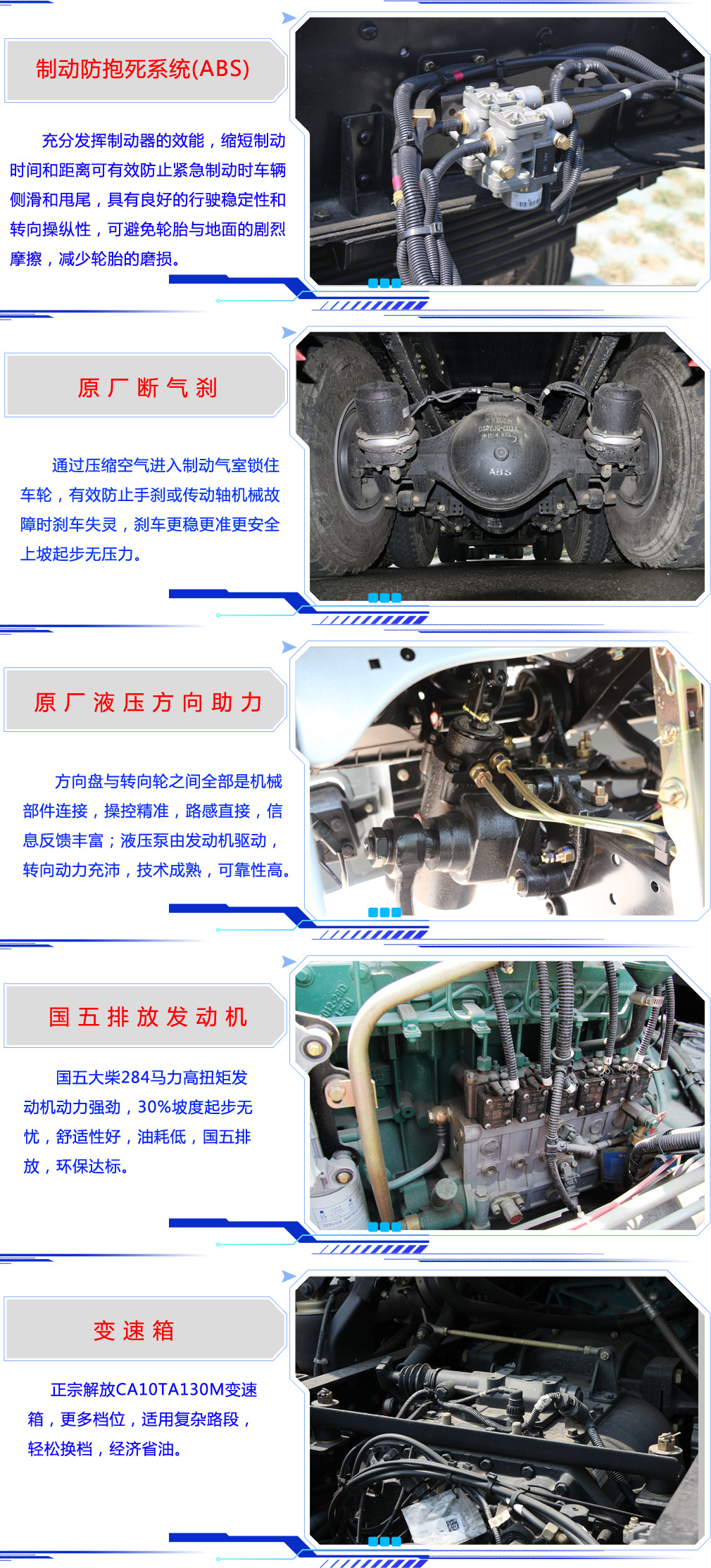 | 其他 | ABS系統生產廠家:浙江萬安科技股份有限公司,型號:VIE ABS-Ⅱ,安裝具有衛星定位功能的行駛記錄儀.發動機與油耗對應關系:(CA6DK1-26E51,CA6DK1-26E5).36.48,35.8 側,后面防護裝置的橫桿材料為Q235A,焊接連接,后下部防護斷面尺寸110×50mm,離地高度為460mm。整車長/軸距/后懸對應關系為(mm):9700/4300+1350/2650,9700/4350+1350/2600,9950/4350+1350/2850,9950/4600+1350/2600 | ||