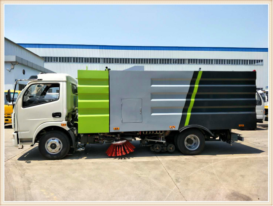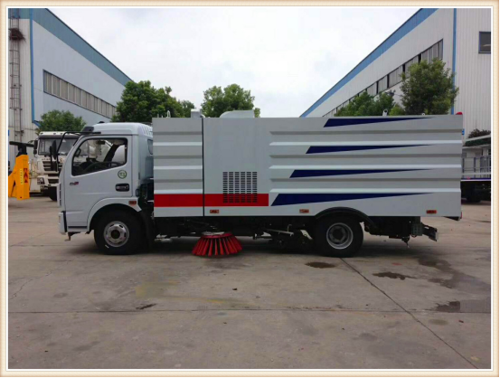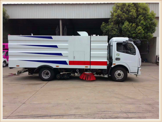 1、東風多利卡洗掃車采用洗,掃,吸,混合的方式收集垃圾,濕式除塵、電液PLC一鍵控制,液壓傾翻卸料的作業方式對路面進行清掃作業。
