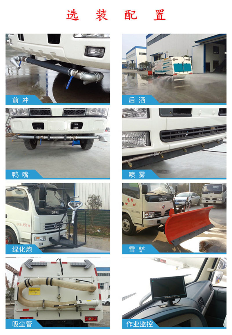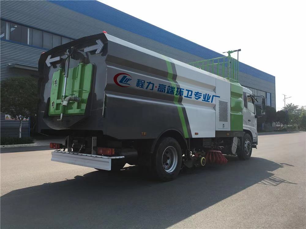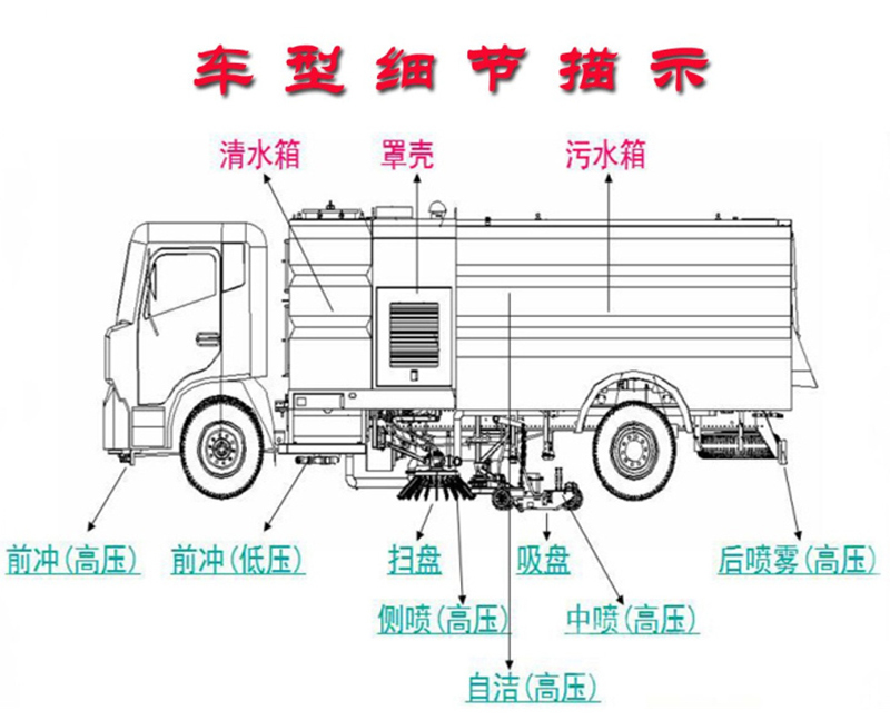該洗掃車采用東風(fēng)天錦二類底盤改裝,加裝副發(fā)動機(jī)、風(fēng)機(jī)、清水箱、垃圾箱、左右立掃、掃盤降塵系統(tǒng)、左右高壓側(cè)噴高、吸盤內(nèi)置高壓主噴桿、氣動系統(tǒng)、液壓系統(tǒng)、專用裝置電控系統(tǒng)和副車架等改裝而成。