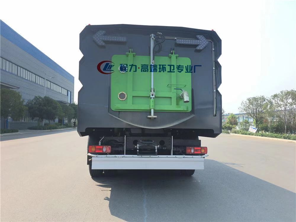 ●清水箱和垃圾箱分體布置,有效空間利用最大化,一次連續(xù)作業(yè)時間長。同時在作業(yè)過程中可通過污水排放裝置對污水進(jìn)行排放,隨時加清水繼續(xù)作業(yè);垃圾箱采用雙油缸自卸卸料,箱內(nèi)同時設(shè)有大流量高壓噴嘴,可快速沖洗垃圾箱