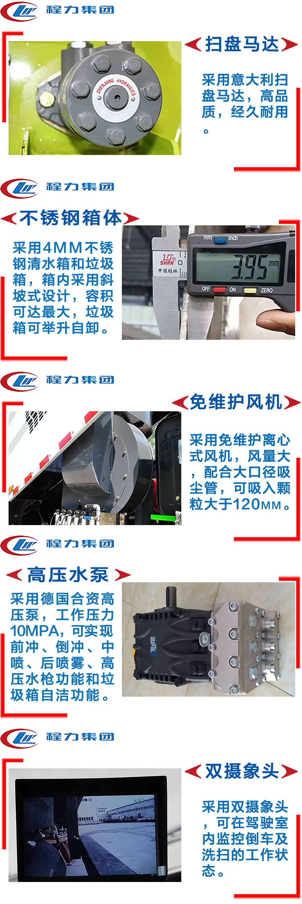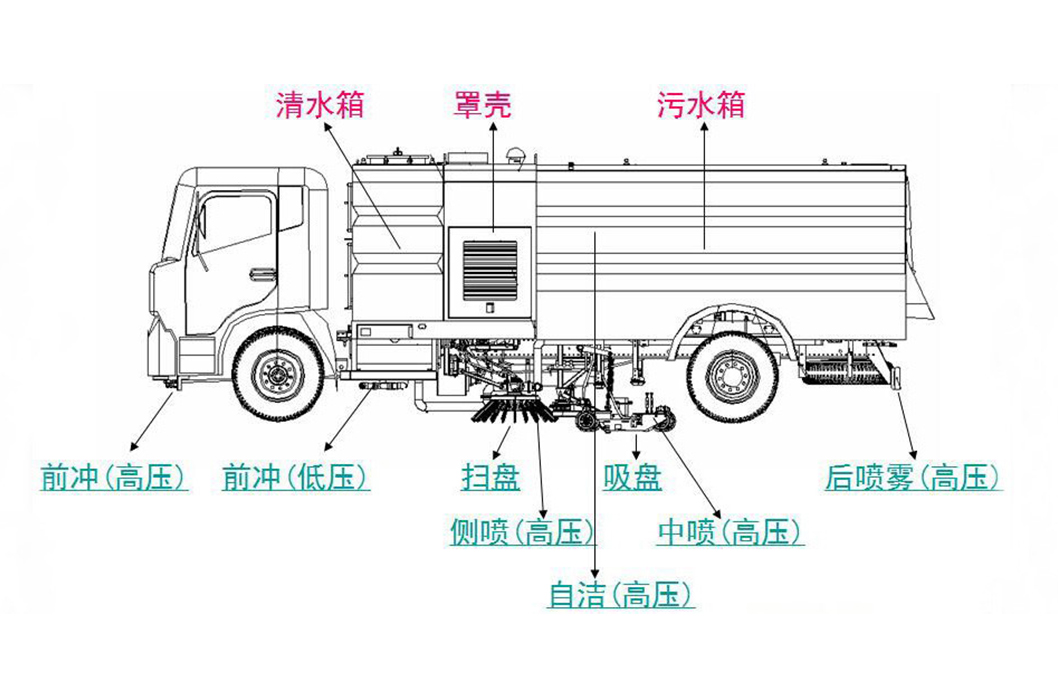 | 其他 | 隨底盤選裝駕駛室,選裝吸盤中置和雙掃刷及無掃刷結構,選裝后部結構;選裝弧形垃圾箱。側防護由專用裝置代替。后防護采用冷彎鋼/Q235-A,焊接連接。后防護截面高度尺寸240mm, 截面寬度尺寸60mm,下邊緣離地高度400mm。ABS型號/企業: ABS-E 4S/4M/威伯科汽車控制系統有限公司。 | ||