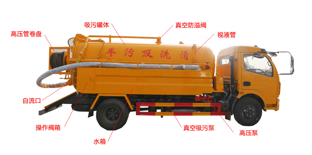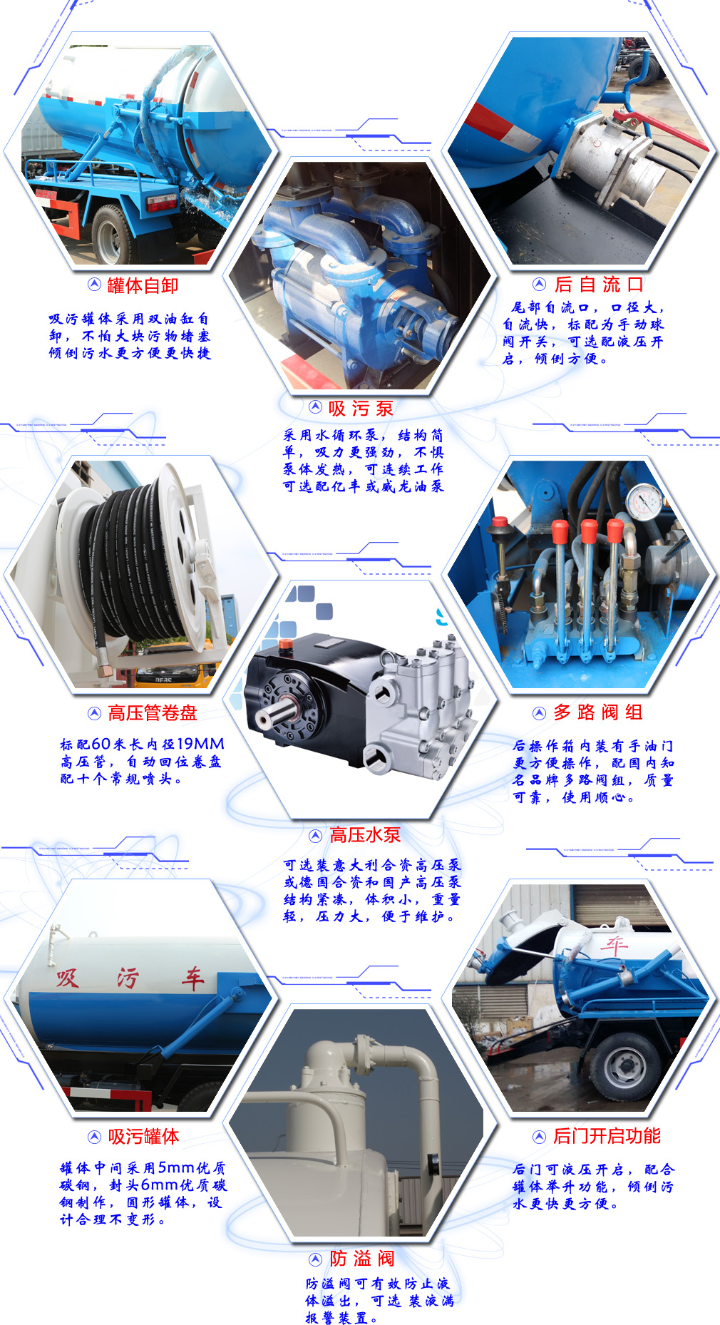 | 其他 | 水罐罐體有效容積:3.05立方米,運輸介質: 水,密度:1000千克/立方米,罐體尺寸(mm):長2100,直徑1400。吸污罐罐體有效容積:3.38立方米,運輸介質: 液態污物,密度:900千克/立方米,罐體尺寸(mm):直段長2000,直徑1400。水罐和吸污罐為兩個獨立罐體,清洗功能時用水罐, 吸污功能時用吸污罐,清洗吸污兩種功能不同時使用,兩罐不能同時滿載。防護材料:Q235A碳鋼,連接方式:左右側面及后下部防護均采用焊接連接,后部防護斷面尺寸(mm):100×40×5,后部防護離地高度(mm) | ||